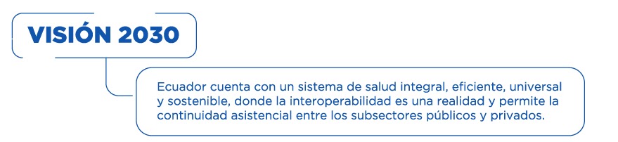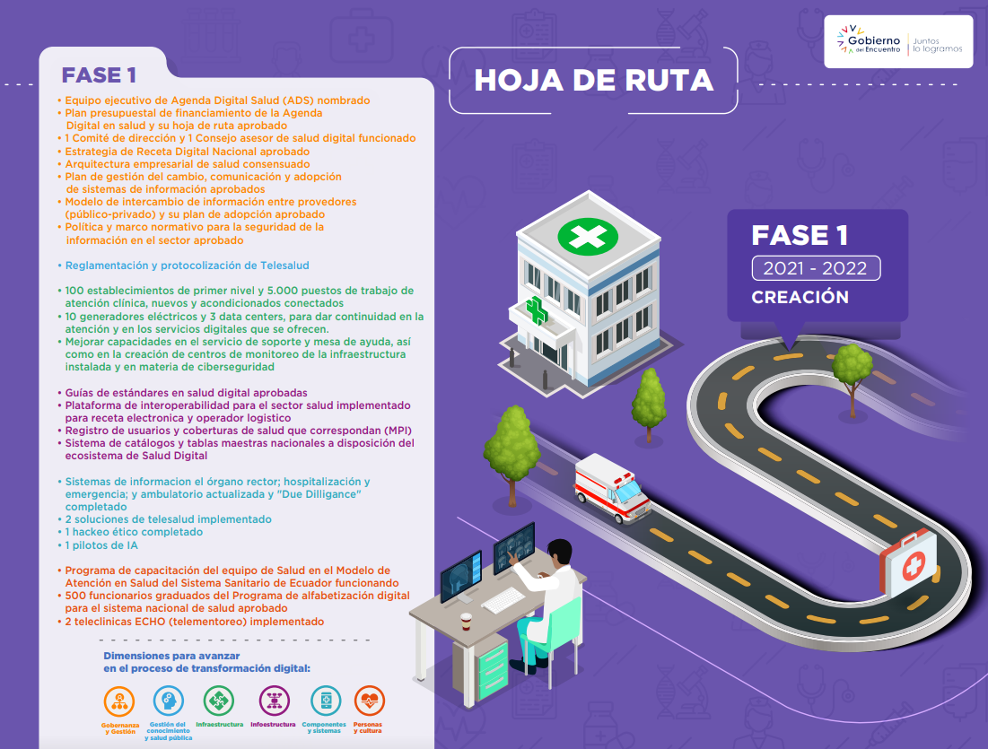 Entre abril y noviembre del año 2020, se desarrolló un proceso de cocreación con el Ministerio de Salud Pública de Ecuador y otras organizaciones y actores claves del país para, en base a la situación actual, elaborar una visión de estado futuro del sistema de salud. Esta visión de futuro se complementa con la elaboración de un mapa de factores críticos de éxito asociados a las metas identificadas y proyectadas. Como parte de la metodología se realizaron también entrevistas a socios estratégicos del sistema de salud. Esta información fue utilizada para construir la Agenda Digital de Salud y Hoja de Ruta. Como resultado de la aplicación de la metodología de creación compartida del Estado Futuro y el análisis de la aplicación de las otras herramientas de transformación digital, la visión consensuada del país en cuanto a su sistema de salud es: